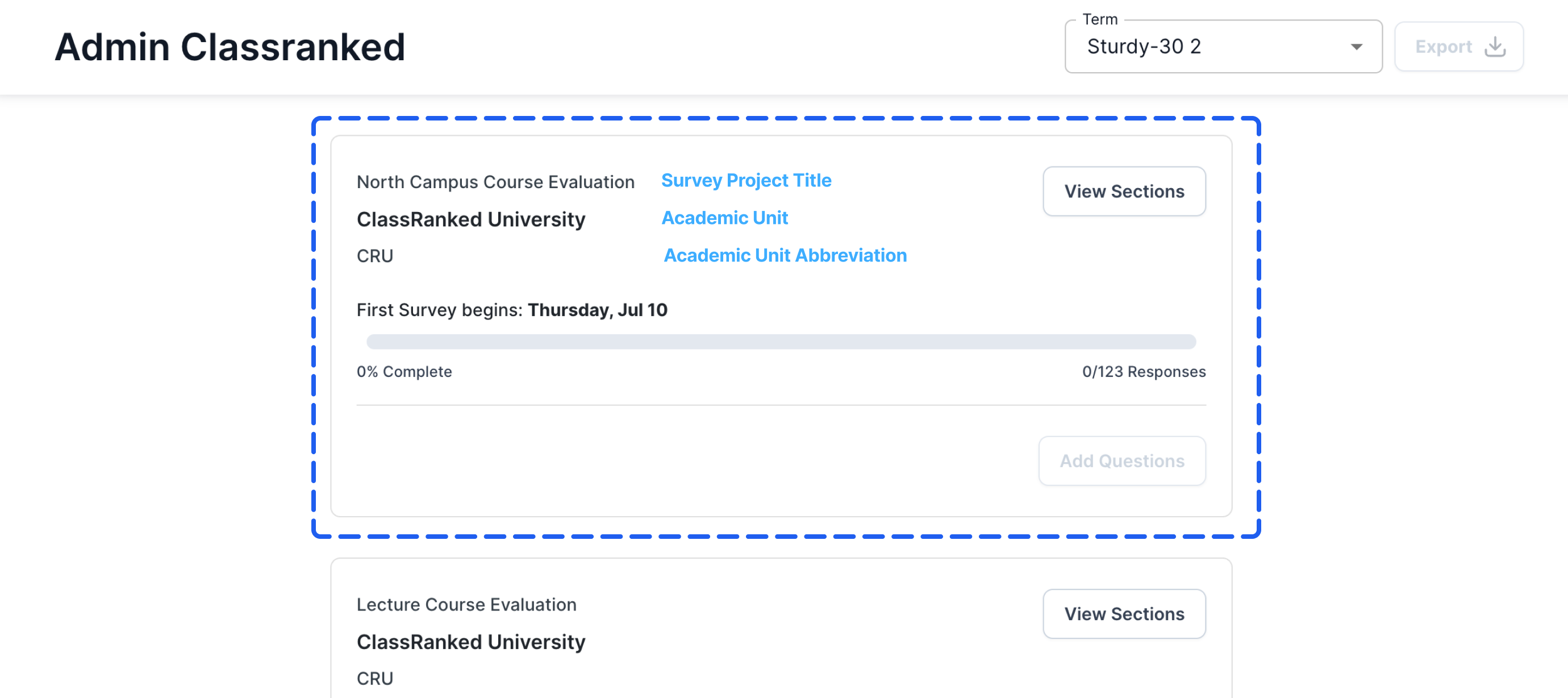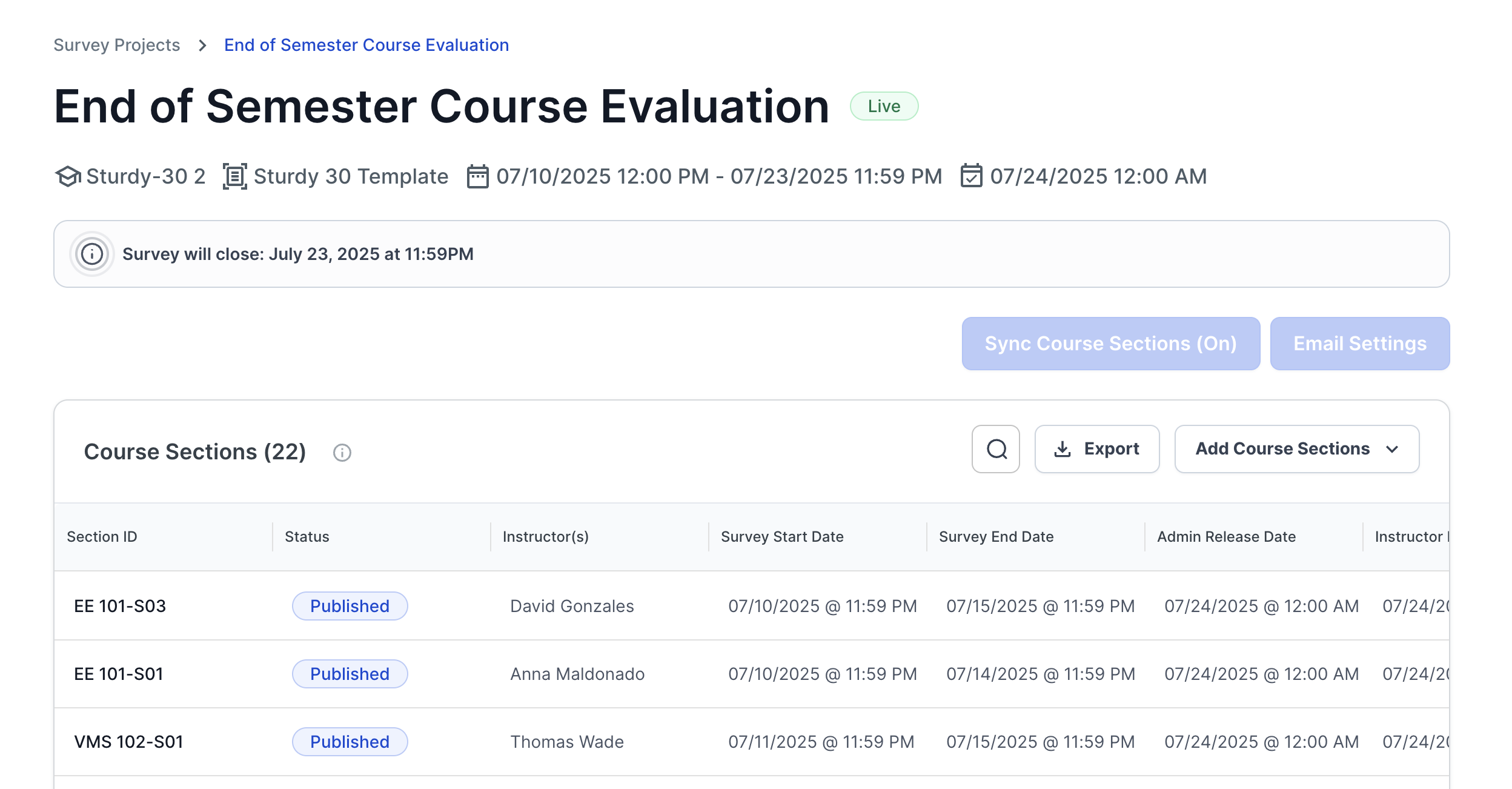 🗺️ If you click "View Sections" from a Survey Card in the Admin Dashboard, you will be taken to the Survey Project page. This page contains a list of all course sections (that you are responsible for) that are in this specific Survey Project.