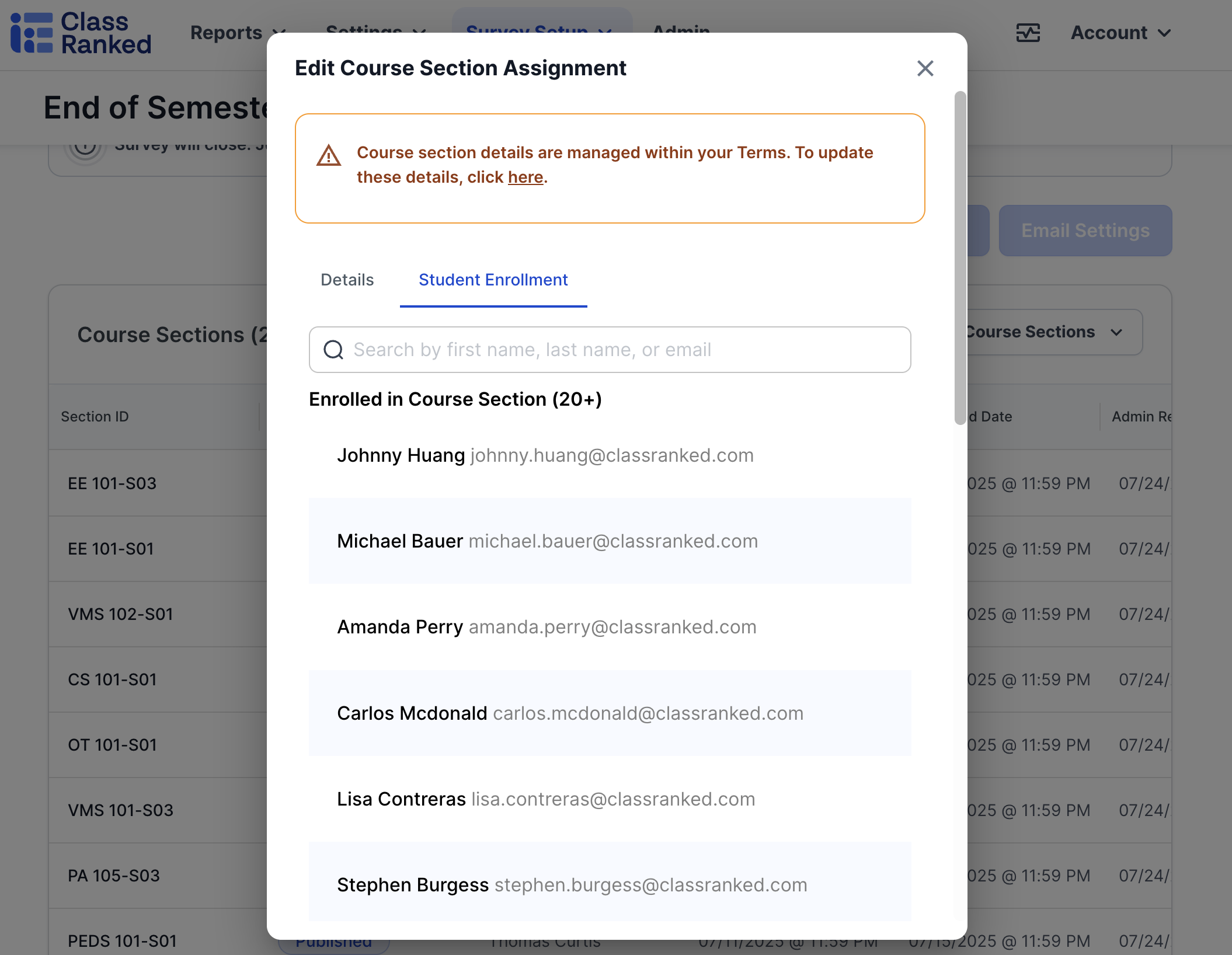 🗺️ By double clicking on any row of the course sections table in the Survey Project page, you can see the survey details for that sections as well as a tab to check student enrollments.