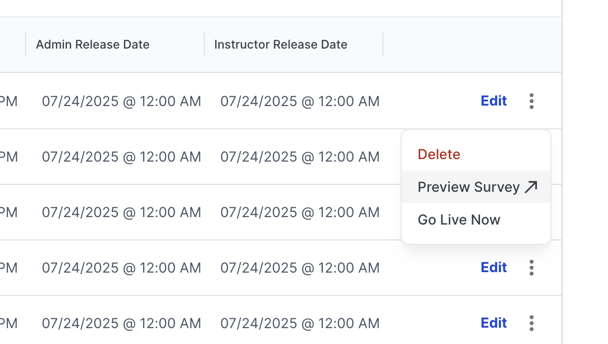 - Preview the survey students will see, including conditional logic (e.g., follow-ups based on answer, survey sections that display based on logic)
