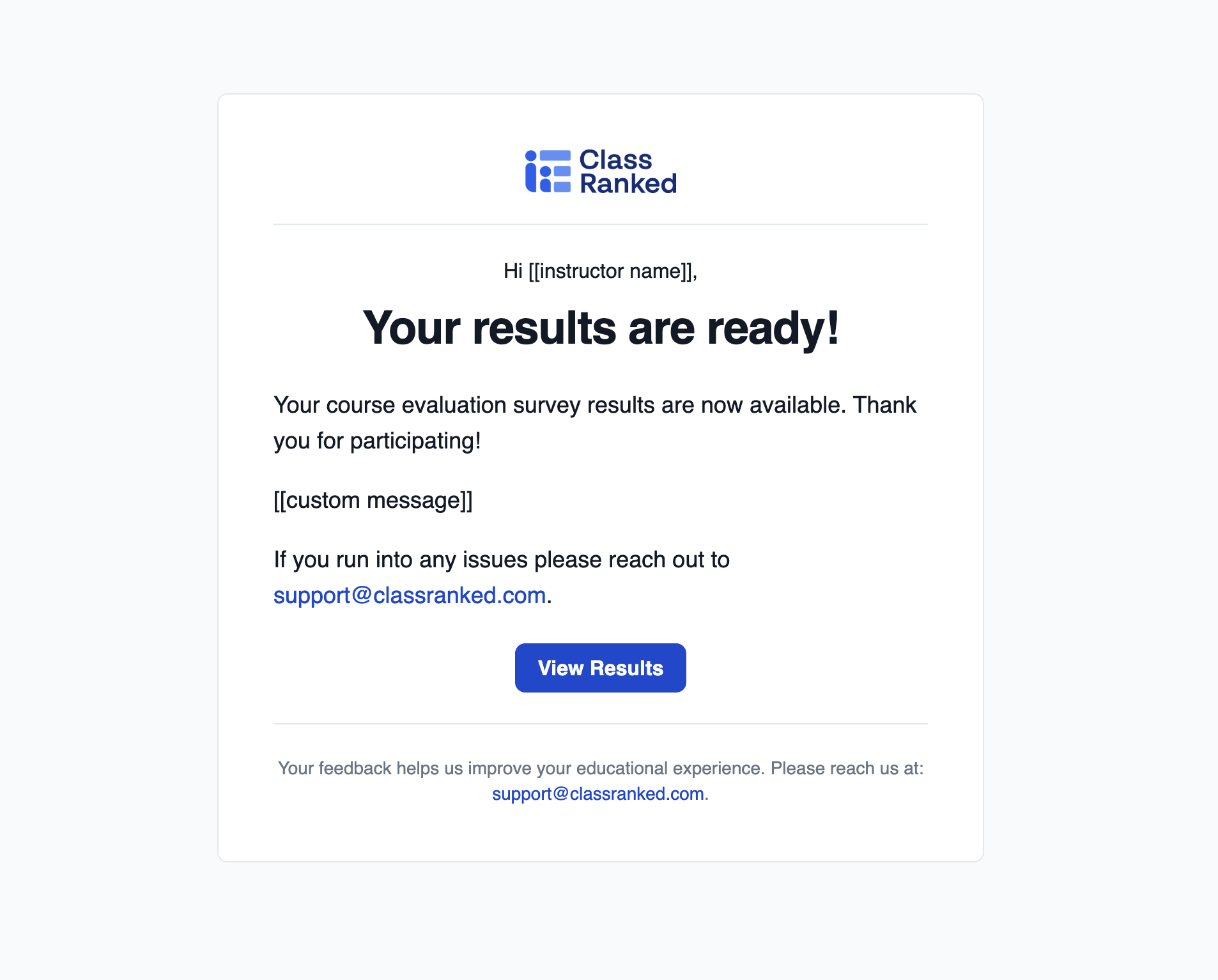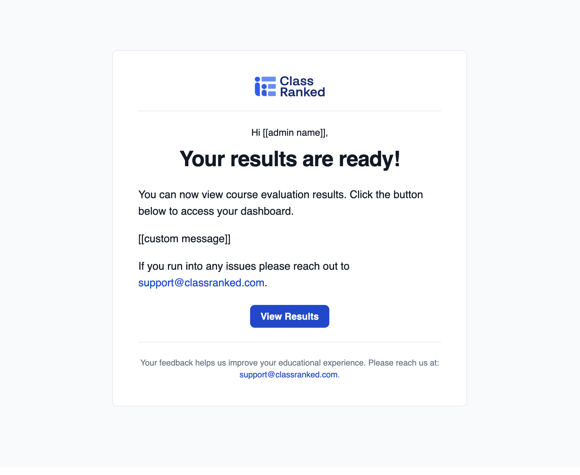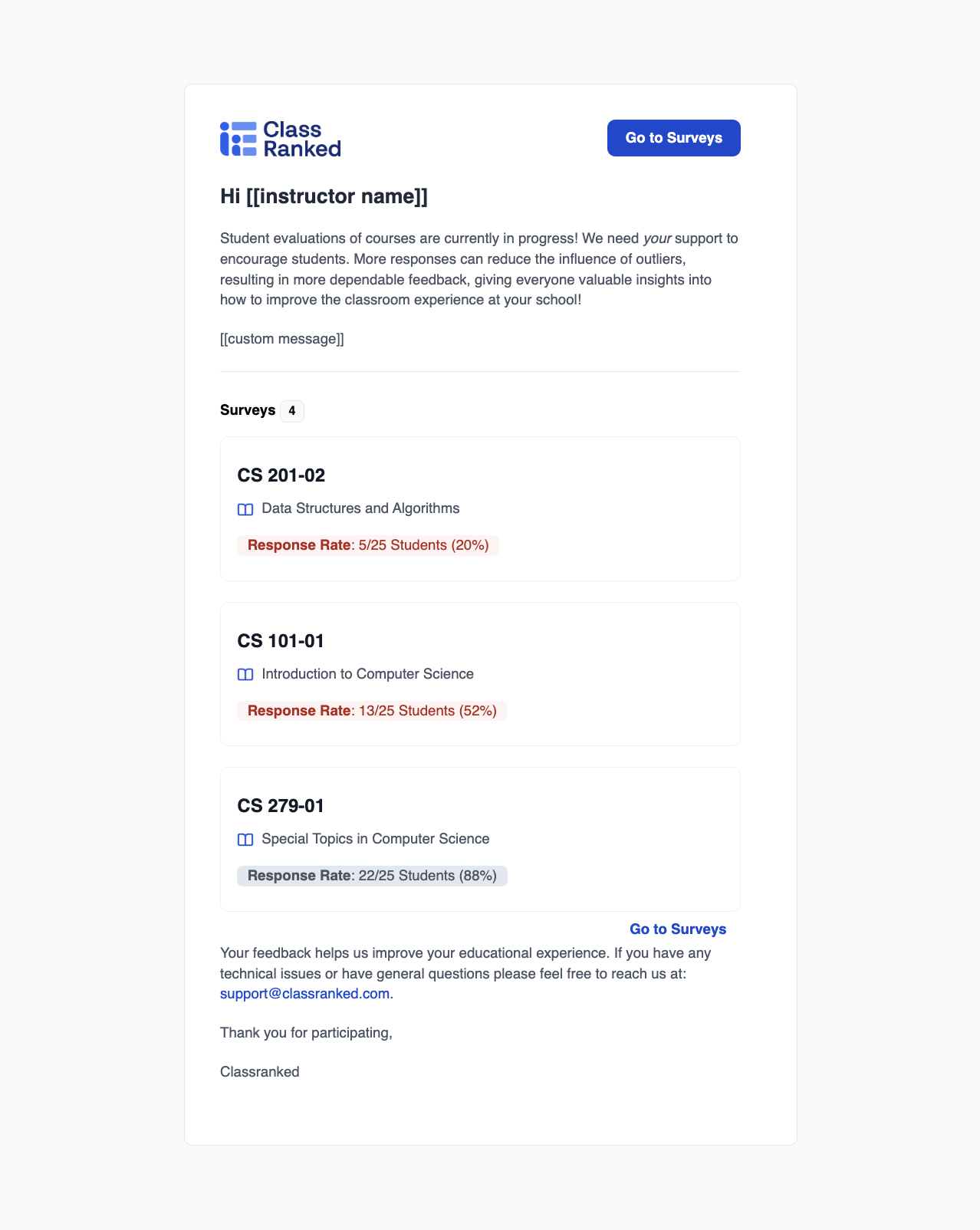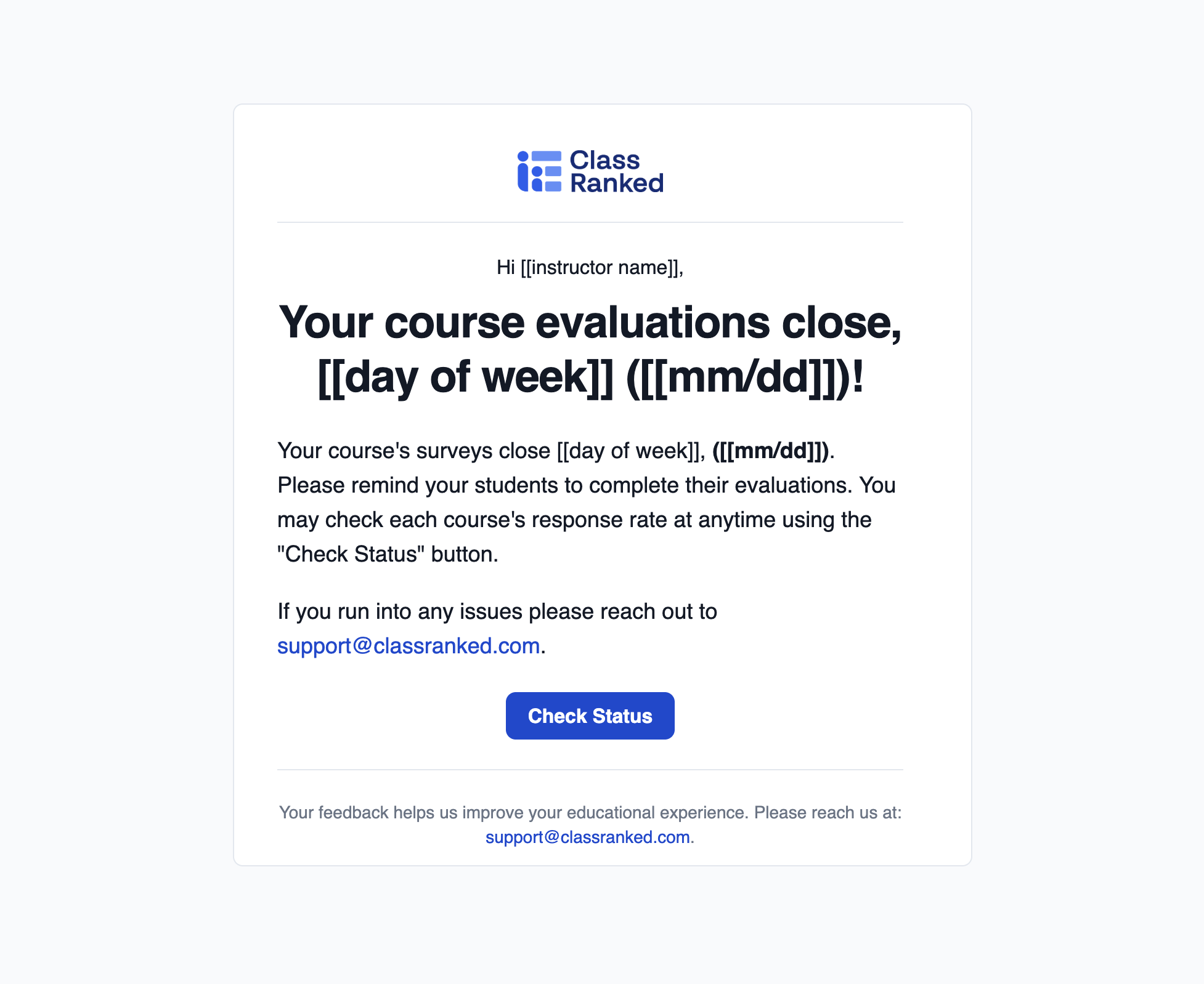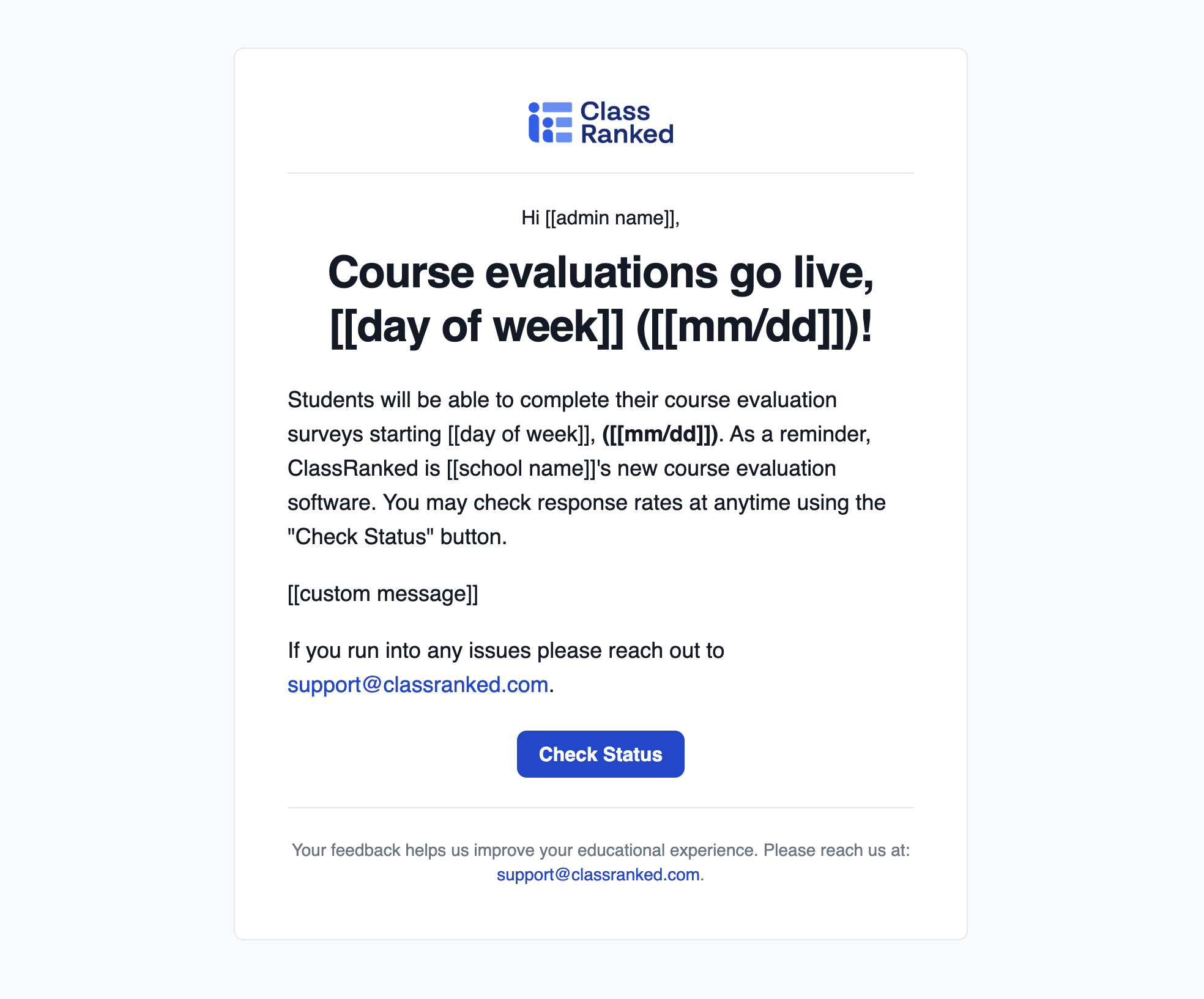 ClassRanked provides a set of email templates that go out automatically during the course evaluation process. As an admin, you can control: