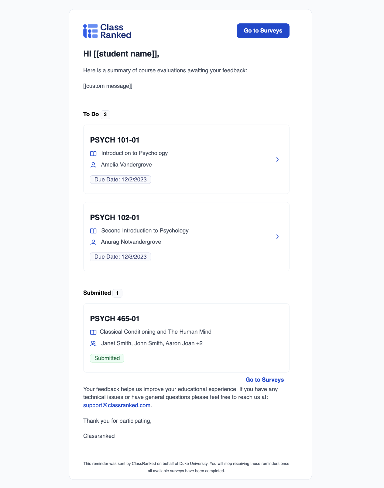 Behavior: An email is sent on the first day the survey is live and once on the day the survey closes, regardless of frequency. If a student completes all active surveys, they will stop receiving emails.